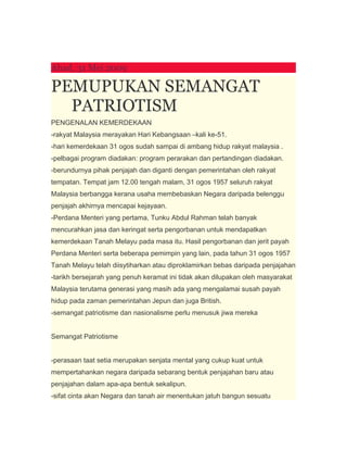 PENDAHULUAN Mutakhir ini semangat patriotik dalam kalangan generasi muda semakin pudar. Antara kepentingan menyambut hari kemerdekaan negara ialah dapat memperhebat jati diri rakyat malaysia agar menghargai kemerdekaan yang telah dikecapi. Dengan wujudnya semangat cinta akan negara di kalangan rakyat pasti negara akan terus aman dan damai.